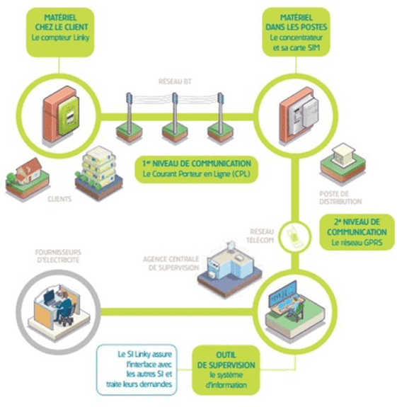 - Il faut ensuite assurer la connexion au CPL. Celle-ci se fait par l’intermédiaire d’un concentrateur qui se trouve dans le transformateur du quartier. Le concentrateur permet d’envoyer les données à Enedis.
